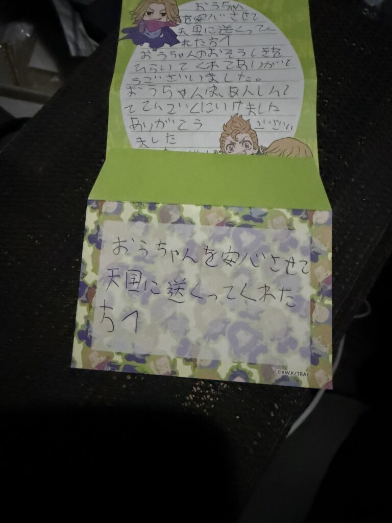Newsお知らせ TOP お知らせ お子様から帰りにお手紙頂きました。 2026.04.21 News お子様から帰りにお手紙頂きました。 宇城市のワンちゃん最後のお別れのお手伝いをさせて頂いた後、帰りにお子様からお手紙を頂きました。感謝です。とても励みになります。 前の記事へ 一覧へ戻る 次の記事へ よくあるご質問 お問い合わせ